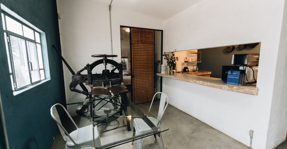 Loft armonioso con acabados arquitectónicos de tipo industrial y con todas las comodidades. Las mesas de este espacio, se diseñaron utilizando equipos industriales.